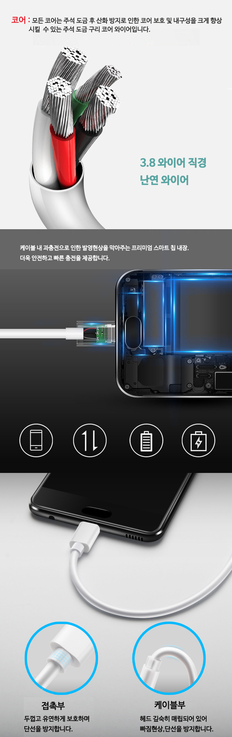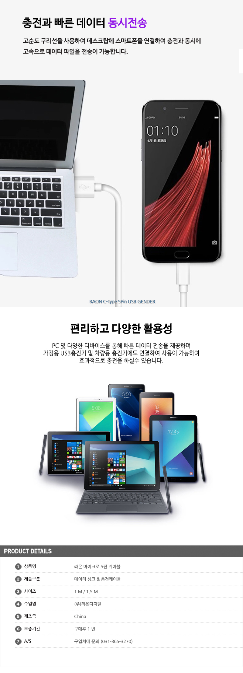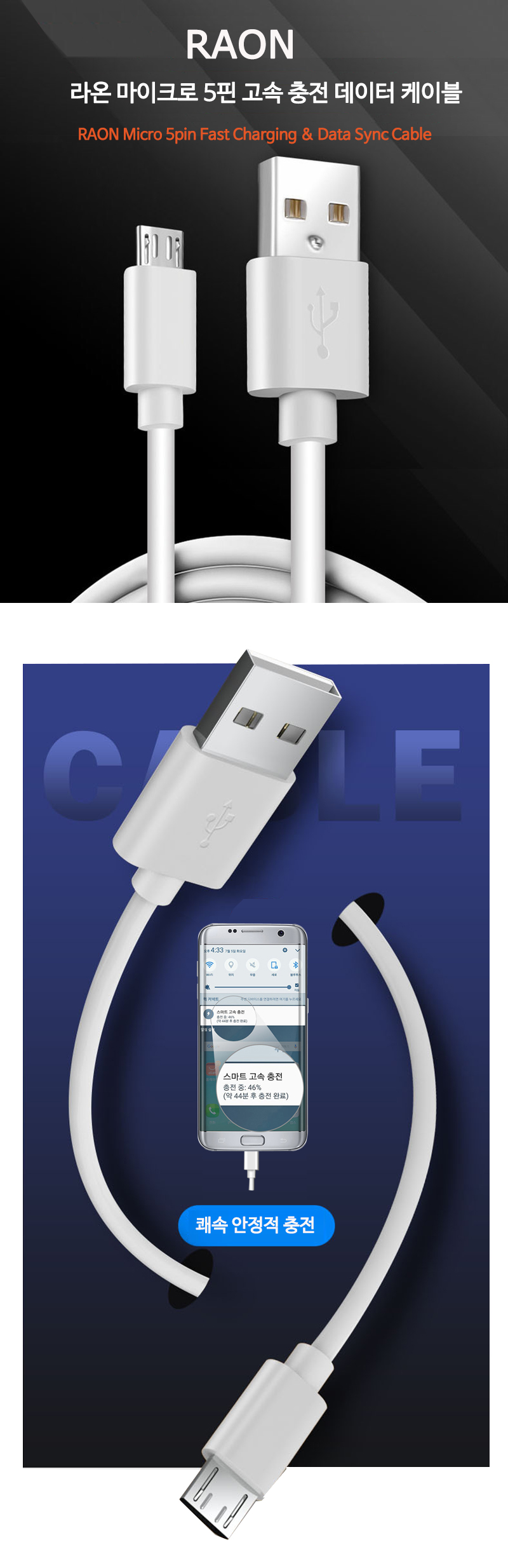 RAON 5핀 퀵차지 급속 고속 충전기 충전케이블 1.5M 화이트